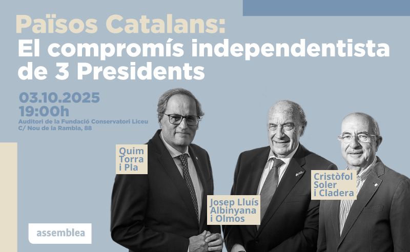 L’Assemblea ha reunit els presidents Torra, Albinyana i Soler a Barcelona per analitzar el present i el futur dels Països Catalans i renovar el compromís independentista. L’expresident de la Generalitat, Quim Torra, s’ha mostrat molt crític amb l’estratègia dels últims anys dels partits independentistes: “amb el resultat extraordinari del Primer d’Octubre i un suport a la independència que es mou entre el 40 i el 45% és incomprensible que no tinguin com a prioritat absoluta plantejar un programa radical per a la independència.”